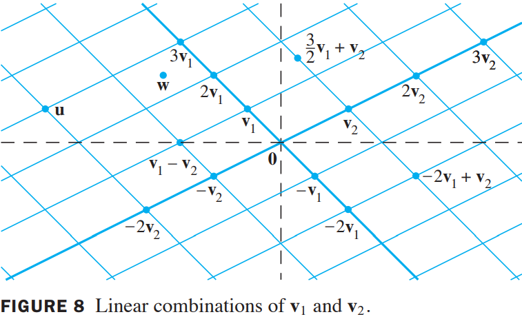 위의 그림을 제외하고도 가능한 조합은 얼마든지 가능하고, 저 2차원 평면의 모든 점을 정의할 수 있다는 것을 우리는 직관적으로 알 수 있다. u의 경우 0에서 v1 방향으로 3번, -v2 방향으로 두 번 이동한 벡터라는 것을 알 수 있다.
