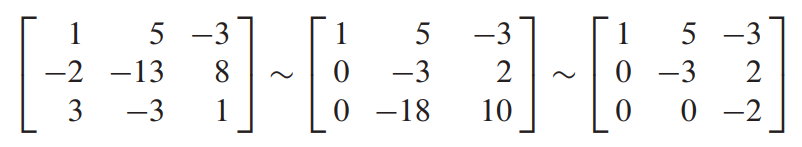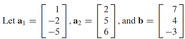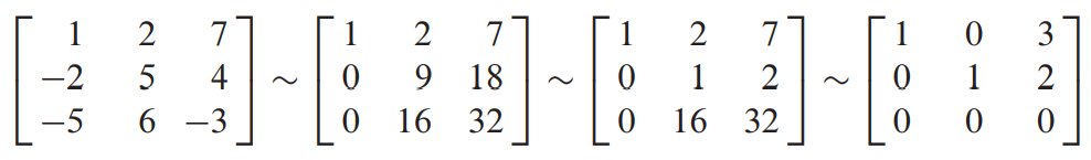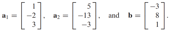 마지막 Equation이 0 = -2 이므로 Solution이 존재하지 않는다. 따라서 b는 Span {a1, a2}에 속하지 않는다.