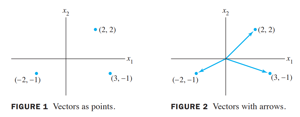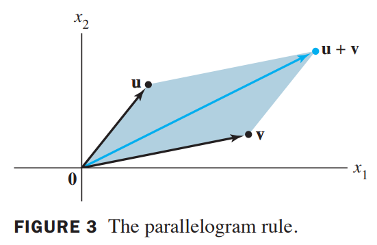 두 가지 방법이 존재한다. 왼쪽에 존재하는 것처럼 점으로 표시하는 것과 오른쪽에 존재하는 것처럼 화살표로 표시하는 방법이 있다. 화살표를 이용하면 Vector임을 확실하게 알 수 있다. 이때 우리는 Vector의 합을 자주 사용하는데, 기하학에서도 이것이 쉽게 보여진다. Parallelogram Rule for Addition 두 벡터가 R2에 있을 때, 두 벡터의 합은 두 벡터가 만드는 평행사변형의 네번째 점이고, 나머지 세 점은 두 벡터와 0을 의미한다. 아래 사진을 통해 확인해보자.