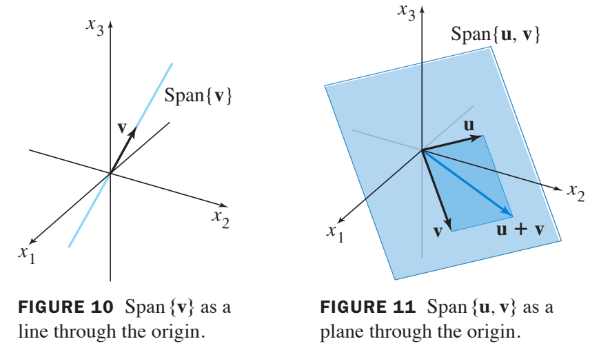 u, v, 0 Vector가 존재한다고 가정하자. 이때 R3 차원을 이용하여 설명하도록 하겠다. 먼저 왼쪽 그림은 v의 Span이다. v가 구성할 수 있는 모든 조합은 저 방향의 직선 내에서 Scaling, 방향을 -로 바꾸는 정도일 것이다. 이제 오른쪽을 보자 Span {u, v}이다. 이때는 u와 v가 만들 수 있는 모든 조합은 저 평면이 된다.