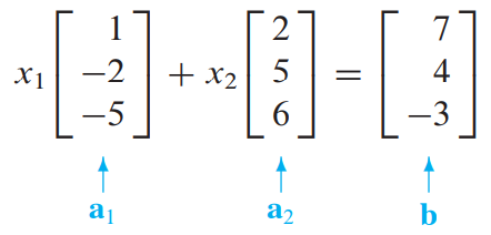 따라서 x1 = 3, x2 = 2라는 답을 얻게 된다. 그러므로 b는 x1 = 3, x2 = 2일 때, a1과 a2의 Linear Combination으로 정의될 수 있다.