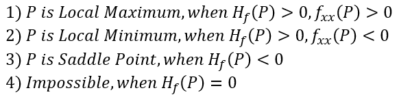 이를 통해 P에서의 헤세 행렬식이 0보다 커야 극값이 존재하고, 0보다 작으면 안장점인 것을 알 수 있다. 만약 0이라면 판별할 수 없다.