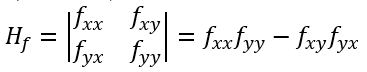 이 행렬의 행렬식을 헤세 행렬식이라 하고 Hf로 나타낸다. 따라서 헤세 행렬은 아래와 같다.