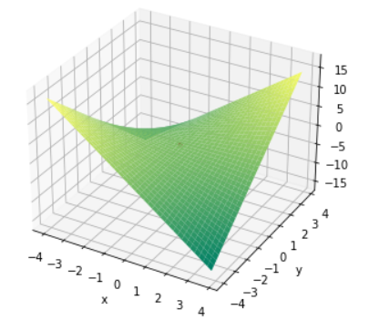 위의 사진을 보면 (0, 0) 지점에서 말의 안장과 같은 모습을 하는 것을 볼 수 있다. 그렇기에 우리는 이것을 안장점이라고 부른다.