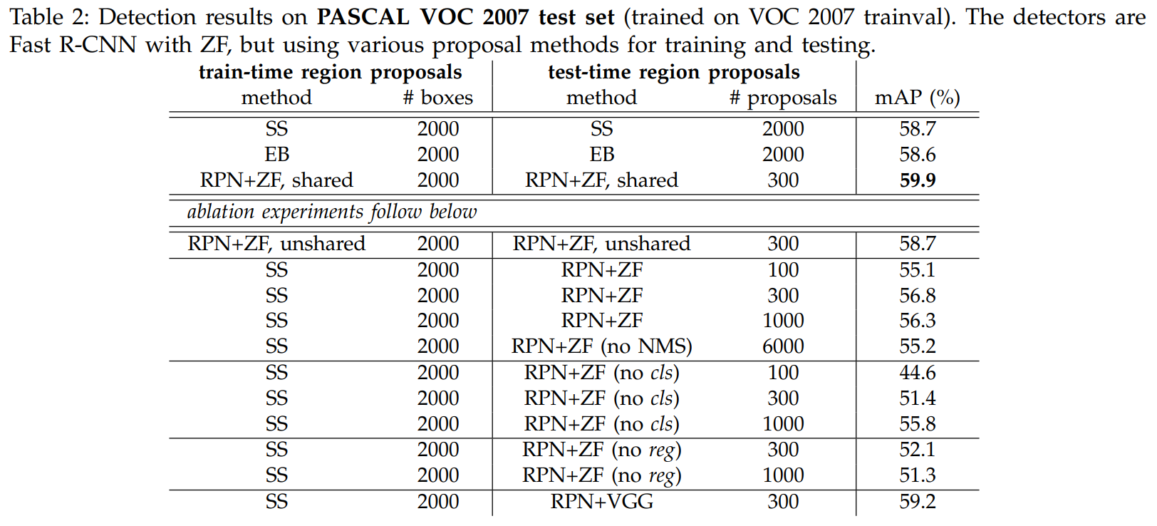 표를 통해 알 수 있듯이 Selective Search나 EdgeBoxes보다 ZF에 RPN을 사용한 것이 mAP도 높았고, 사용한 Proposal 수도 적었다.
