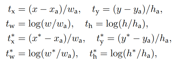 Bounding Box Regression을 위해 4개의 좌표값을 다음과 같이 표현하였다.