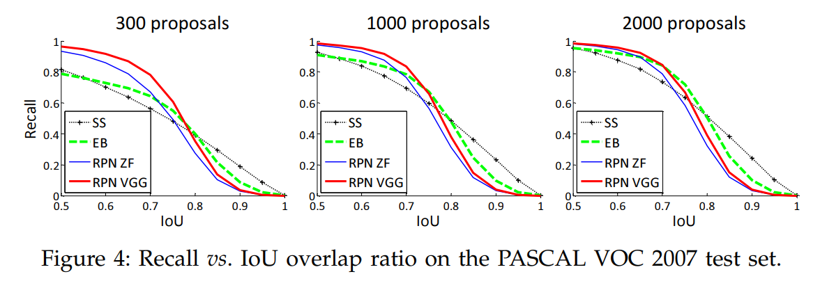 IoU Threshold 값에 따른 Recall을 계산하는 실험을 진행하였다. 아래 사진은 Proposal 갯수가 각각 300, 1000, 2000개일 때 실험한 것이다. SS와 EB, RPN을 비교하였고, N개의 Proposal만 남기는 NMS를 진행하였다.