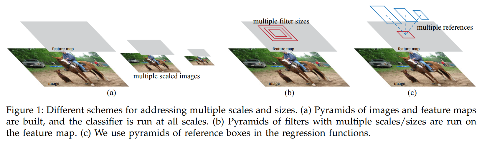 첫 번째는 Feature Pyramid 방식이다. 영상을 Resize하여 여러 크기의 영상을 만들고, 각 영상에서의 Feature를 뽑아내어 사용한다. 이는 유용하게 사용되지만 시간이 오래 걸린다는 단점이 있다. 두 번째 방법은 여러 크기의 Sliding Window를 쓰는 것인데, 여러 크기의 Convolution을 사용한다고 생각하면 된다. 이 방식은 첫 번째 방법과 함께 사용되는 것이 일반적이다. 이와 비교하여 이 논문에서 말하는 방법은 pyramid of anchor 방식이다. 계산량도 적고 사진도 한 장에 대해서만 계산하면 된다.