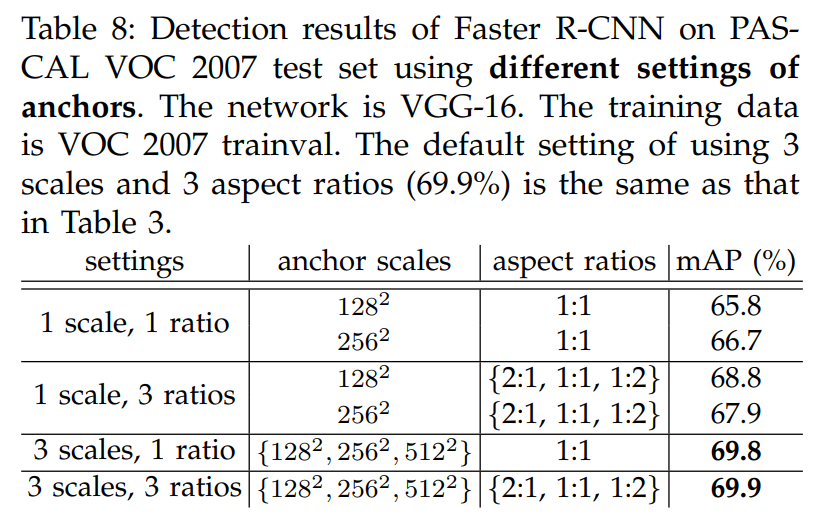 이를 통해 앵커의 갯수가 늘어날수록 성능이 증가하는 것을 볼 수 있다. 특히 3 Scale을 사용했을 때 성능 개선이 일어났다.