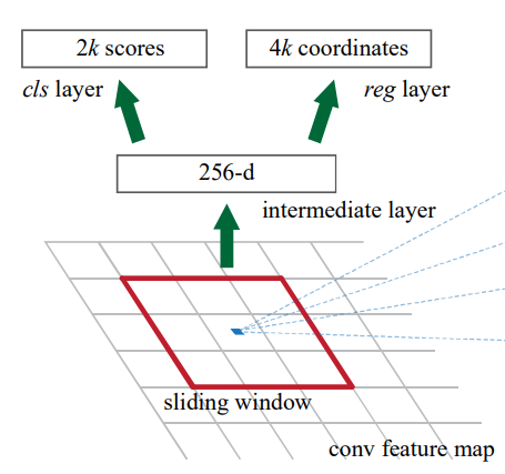 RPN은 Image를 입력으로 받아서 객체에 대한 Score와 함께 사각형의 물체 Proposal을 추출한다. Fully Convolution으로 구성되어 있으며, 이 이유는 Fast R-CNN과 계산을 공유하기 위함이다. 기존의 공유 가능한 Convolution Layer가 있는 모델에는 ZF 모델과 VGG-16이 있다. Region Proposal을 생성하기 위해 작은 network를 사용하였는데, feature map을 입력으로 받아 사용하는 Convolution Network이다. 사용되는 Window(Convolution 혹은 Kernel)을 통해 Lower-dimensional feature로 mapping한다. 그리고 Fully Connected Layer를 통해 Box-regression과 Box-classification layer를 생성한다. 아래 사진은 RPN을 자세히 표현한 것이다.