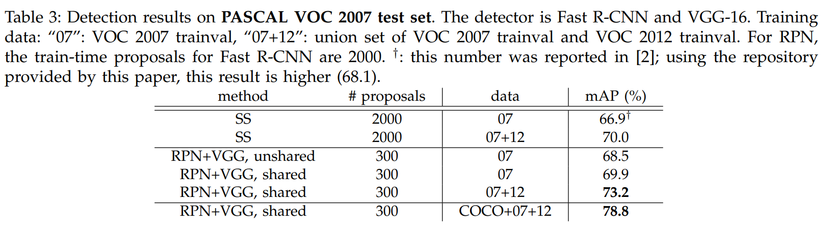 Backbone이 RPN에 미치는 영향을 실험하기 위해 RPN을 학습시킬 때, VGG를 사용하고, Detector를 사용할 때는 Selective Search와 VGG를 그대로 사용하였다. 이때 성능이 올라간 것을 확인할 수 있고, RPN+VGG가 RPN+ZF보다 좋은 것을 의미한다. 심지어 Selective Search를 학습할 때와 Test할 때 모두 사용한 것보다 성능이 좋았는데, 이는 VGG가 Selective Search보다 좋은 성능을 가지는 것을 의미한다.
