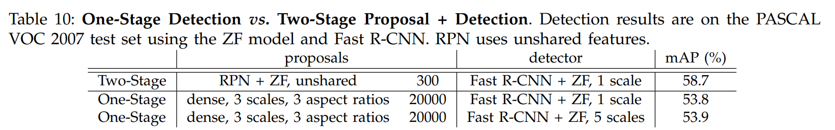 ZF모델을 사용한 One-Stage System이 2-Stage보다 낮은 성능을 보였고, 이를 통해 2-Stage가 성능이 더 좋은 것을 확인할 수 있다. 또한 Proposal을 One-Stage에서 더 많이 사용하므로 속도도 2-Stage가 빨랐다.