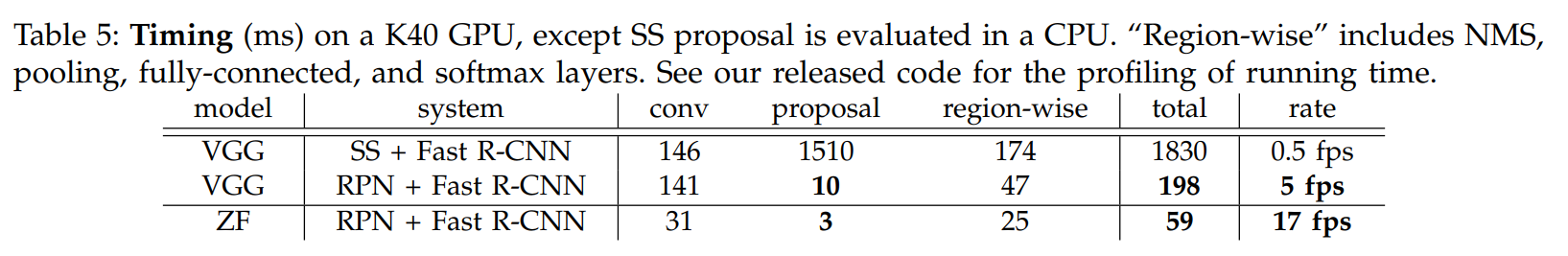위의 표 5를 통하여 Running Time을 확인할 수 있다. 이를 통해 Selective Search보다 RPN이 훨씬 빠른 속도를 보이는 것을 알 수 있고, Detector도 Proposal 수가 줄어들면서 걸리는 시간이 확연하게 줄어들었다.