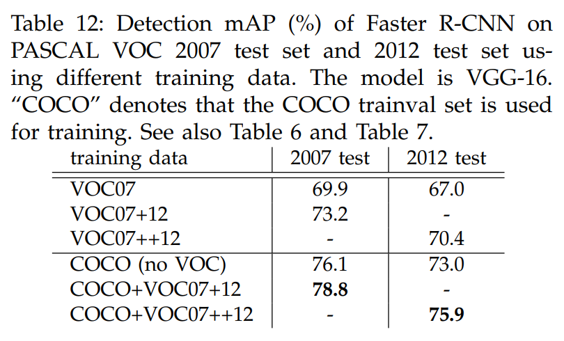 COCO를 통해서 학습했을 때가 VOC07+12보다 성능이 높은 것을 확인할 수 있다. 또한, COCO Dataset과 VOC Dataset 모두 함께 학습하여 사용했을 때, 더 높은 성능을 보이는 것을 알 수 있다.