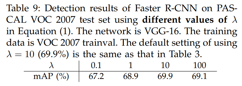 이 표는 위에서 설명했던 Loss의 람다 Parameter 값에 따른 차이인데, 10일 때 성능이 가장 좋았고, 10배 단위로 측정해야 성능 차이가 발생하였다. 논문에서 성능이 가장 좋은 이유로 Normalized Term과 합쳤을 때 비슷하게 가중치가 들어가기 때문이라고 말한다.