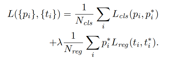 i는 Anchor의 Index를 의미하고, pi는 i번째 Anchor가 예측한 객체가 있을 확률값, pi*는 Ground-truth Label으로 위에서 말한 Anchor에 대한 Label로 Positive면 1, Negative면 0이다. ti는 Bounding Box에 대한 4개 값의 벡터이고, ti*는 Ground-truth Box의 좌표 값이다. Lcls는 Classification을 위한 Loss로 Log Loss를 사용한다. Lreg는 Regression을 위한 Loss로 Robust Loss를 사용한다. pi*와 Lreg를 곱하는 이유는 Regression Loss는 Positive Anchor에 대해서만 활성화되도록 하기 위해서다. Ncls는 Normalize Term으로 mini-batch의 갯수이고, 여기서는 256을 사용하였다. Nreg는 Anchor Location의 갯수로 약 2400개 정도이다. 람다는 10으로 설정하여 cls term과 reg term의 weight를 비슷하게 설정해주었다. 실험을 통해 람다의 값이 중요하고 Normalize Term은 중요하지 않은 것을 밝혀내었다.