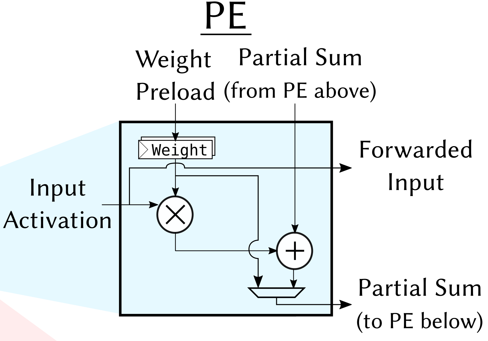 Systolic Array는 NxN 개의 PE(Processing Element)로 구성되어 있으며, 각 PE는 Multiplication과 Addition을 수행한다.