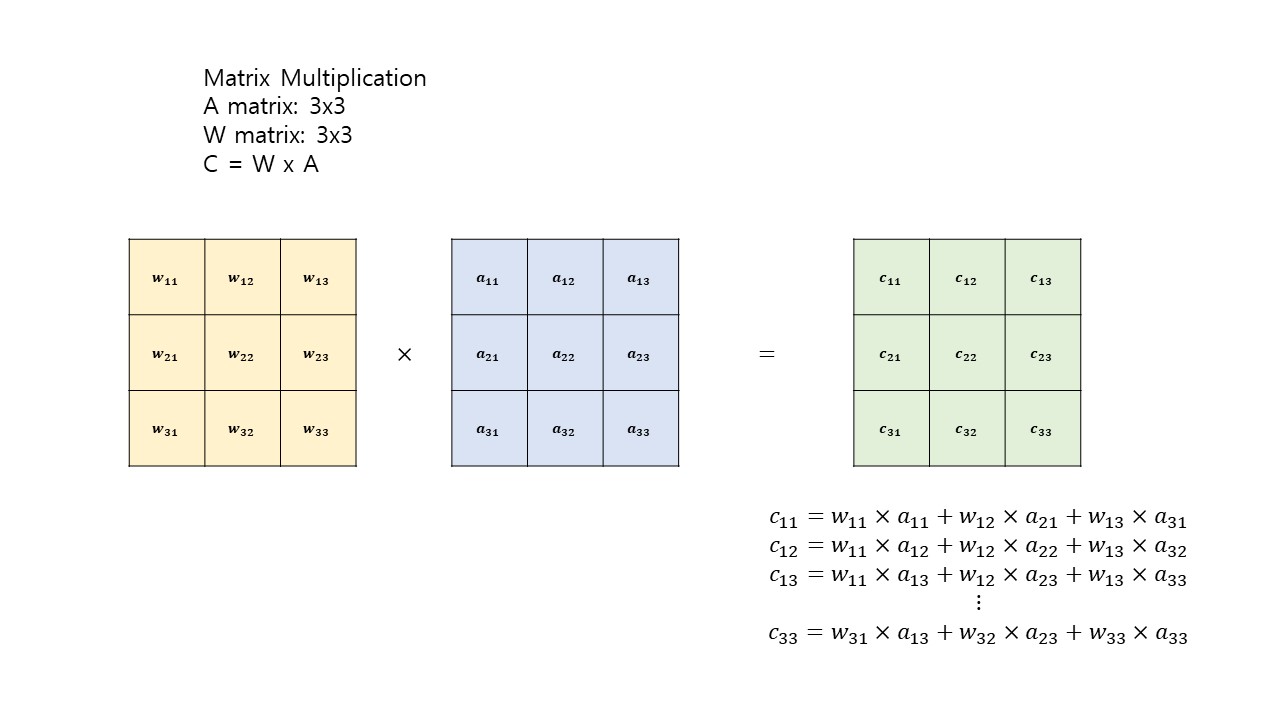 W 행렬과 A 행렬을 곱하는 연산이다. 딥러닝을 해본 사람은 W가 Weight Matrix, A가 Input Matrix이고 GEMM 연산을 진행하는 것임을 알 수 있다.