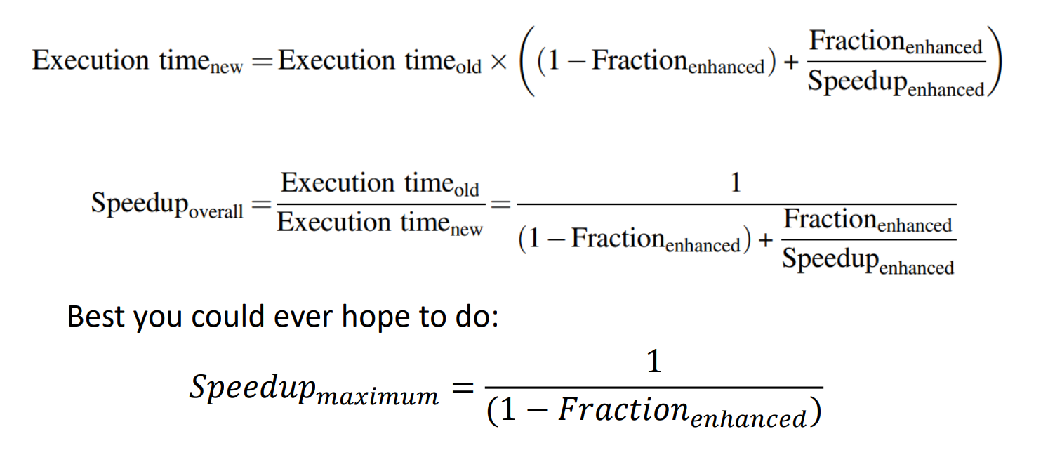 Amdahl's Law는 내가 성능 향상을 시키는 부분이 전체 성능 향상에 얼마나 영향을 미치는지에 대한 법칙이다. 우리가 아무리 성능 향상을 이루었다 하더라도, 그 부분이 전체의 아주 일부분에 불과하면 전체 성능에는 큰 차이가 없을 것이다.
