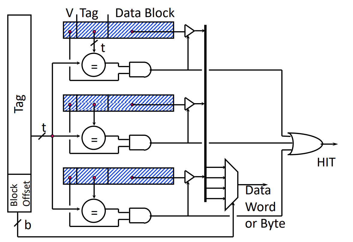 Index 정보가 존재하지 않고 Tag Bit로만 Data Block에 접근한다. 하지만 모든 Cache Line의 Tag Bit를 확인해야 하기 때문에 오래 걸리고 전력을 많이 소비한다.
