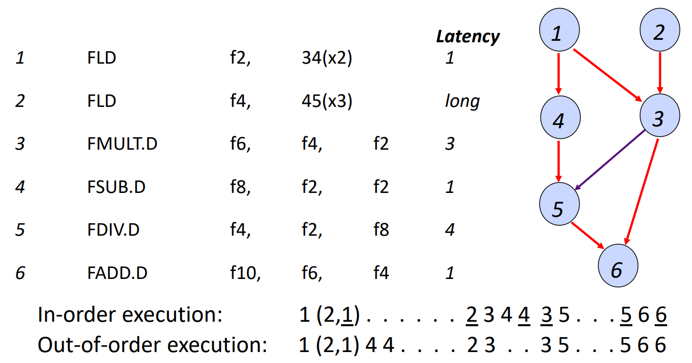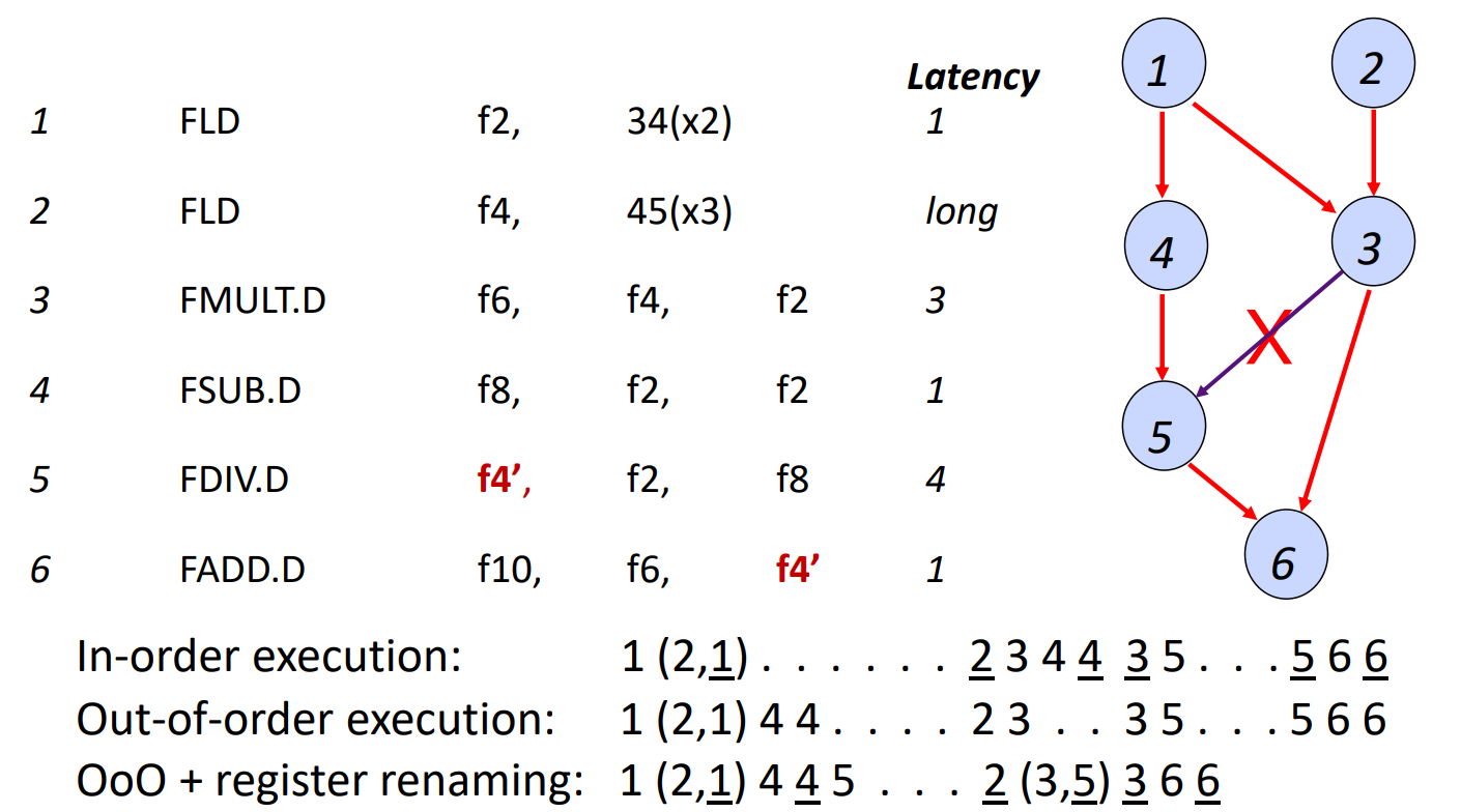 확실한 성능 향상을 위해서는 Register Renaming도 함께 적용되어야 한다. 위의 예시에서 f4 -> f4'으로 변경되면서 3번 instruction과 5번 instruction의 dependecy가 사라지면서 성능 향상을 얻을 수 있었다.