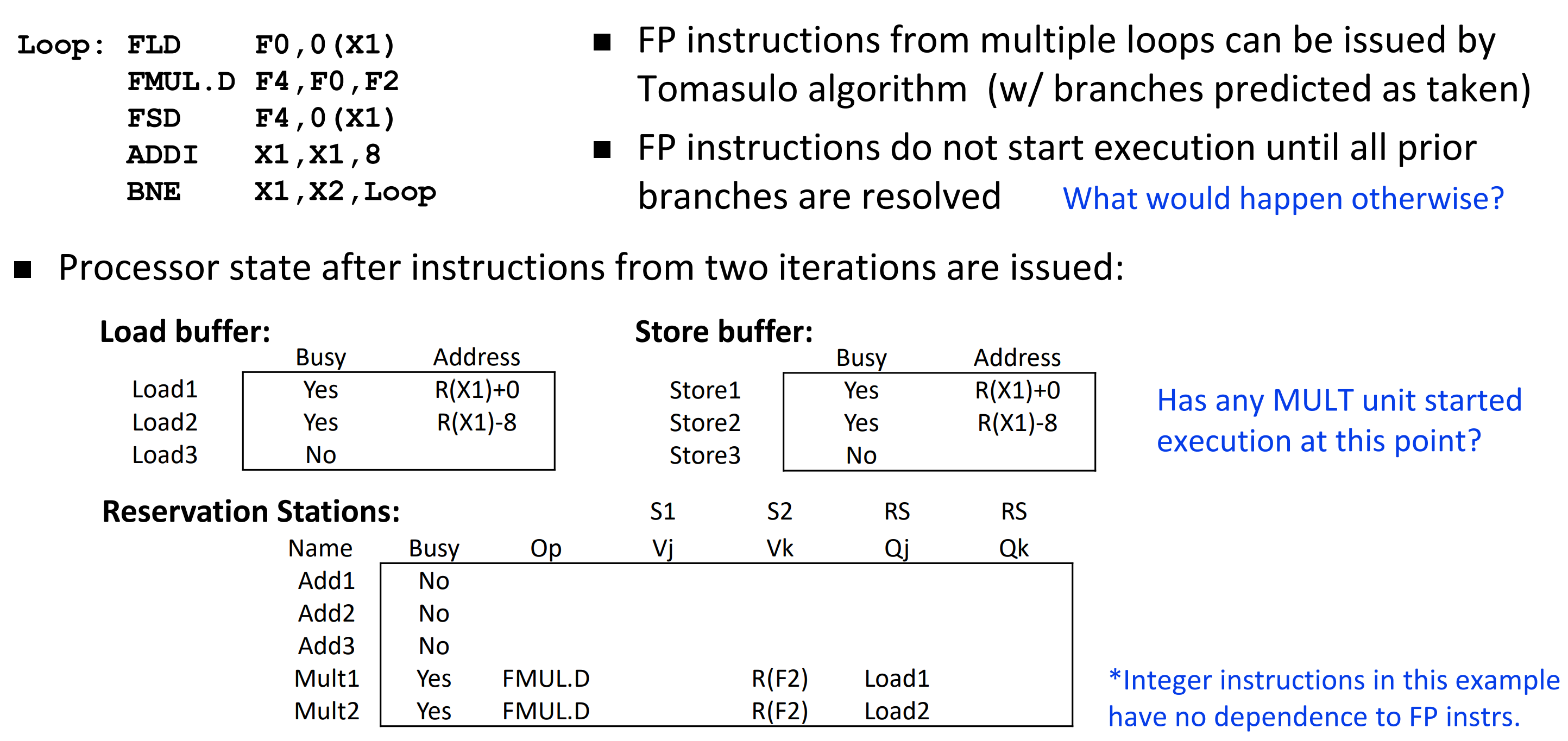 Tomaslo Algorithm은 Branch Prediction을 할 수 있고, Speculative exection이 가능하다. 하지만 Integer instruction들은 in-order로 실행되며, Branch prediction이 Correct인지 확인하지 전까지 FP Operation들은 실행할 수 없다.