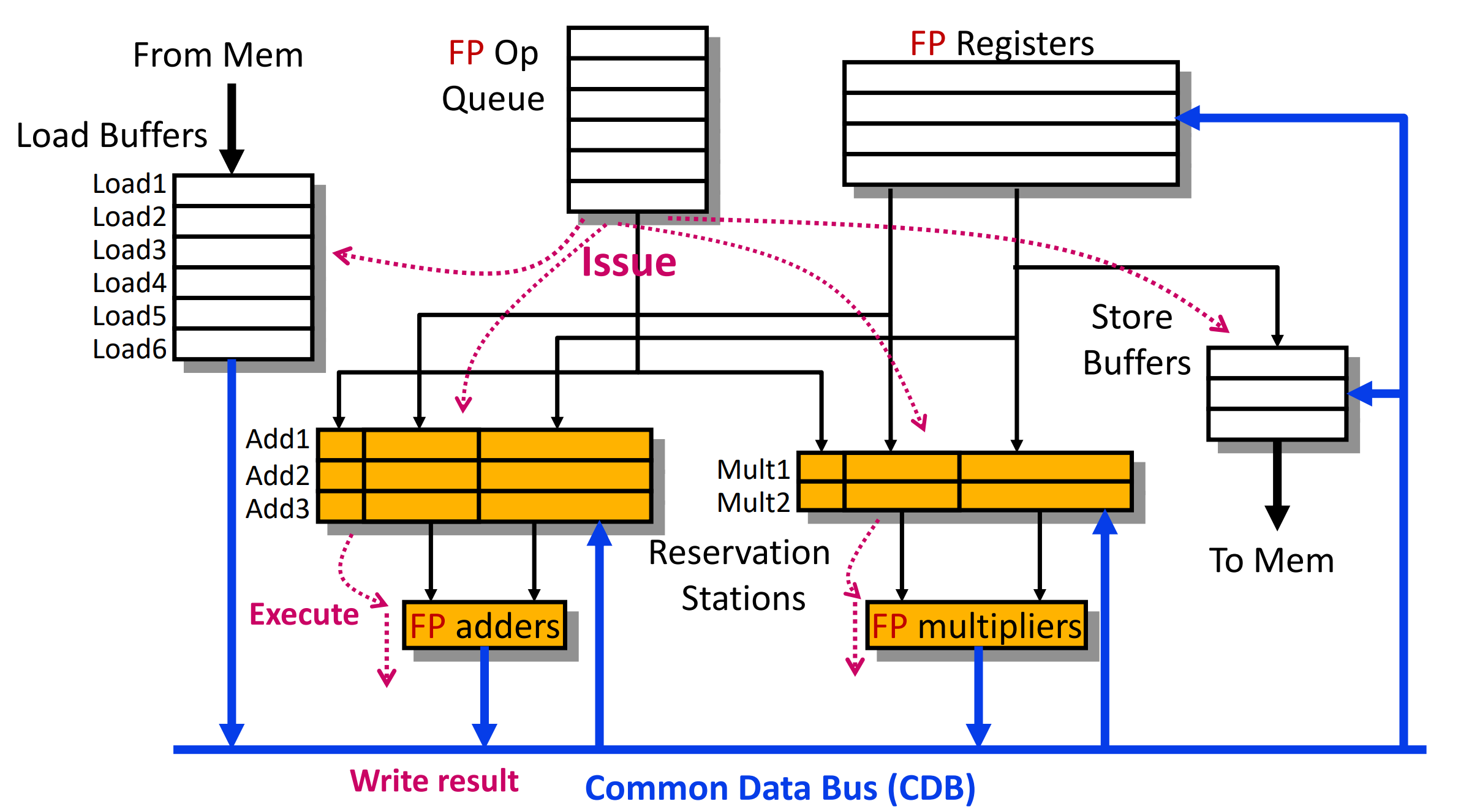 Function Units(FU)에서 나온 결과는 Common Data Bus를 통해 Broadcast 된다. (Not Registers!) 이를 통해 RAW Hazard를 피할 수 있게 된다.