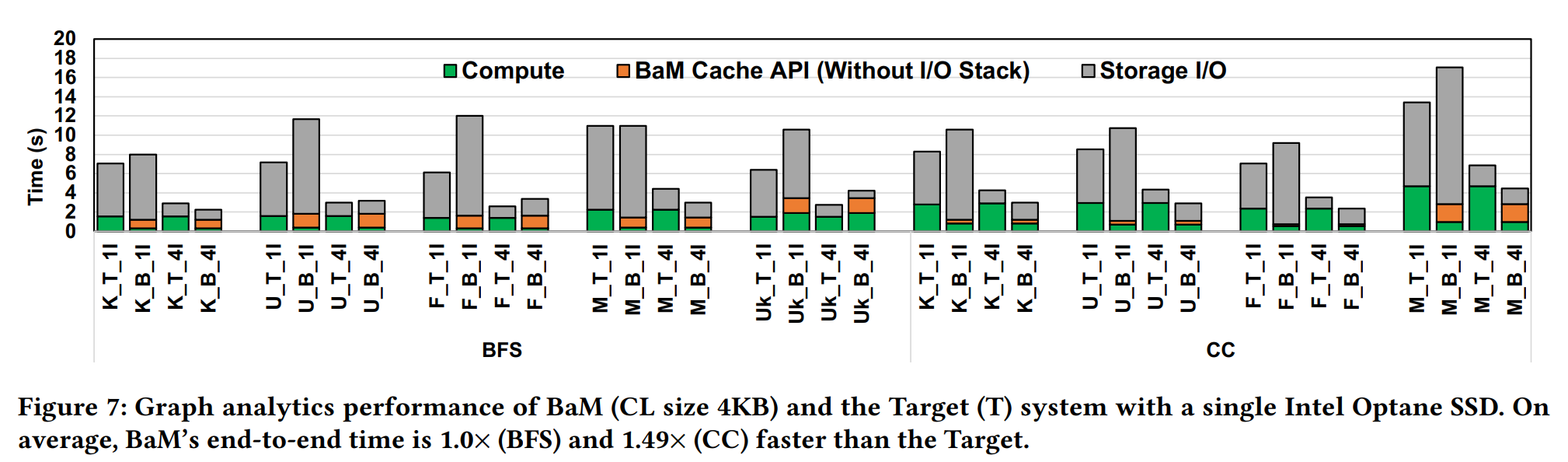 BaM과 Target system을 비교하였다. Target System은 충분한 CPU memory가 있다고 가정한 system이다. 이때 SSD가 1개일 때는 충분히 throughput을 만족시키지 못해 성능 저하가 발생하지만, 4개 SSD를 사용하면서 throughput이 올라가 성능이 더 높아진다.