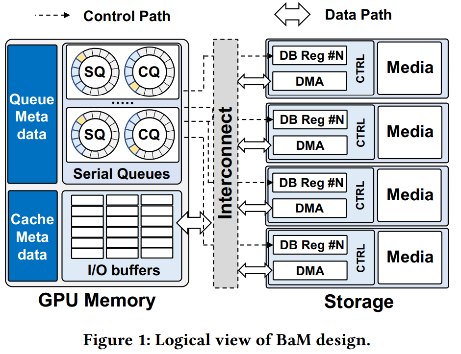 BaM의 목표는 storage 접근에 대해서 1. on-demand 2. fing-grained 3. high-throughput access를 제공하는 것이다. 이를 제공하기 위해 아래 그림 1에서 보이듯, I/O queue를 GPU memory에 두었고, storage에 대한 doorbell register에 mapping 된 address를 GPU memory에 두었다.