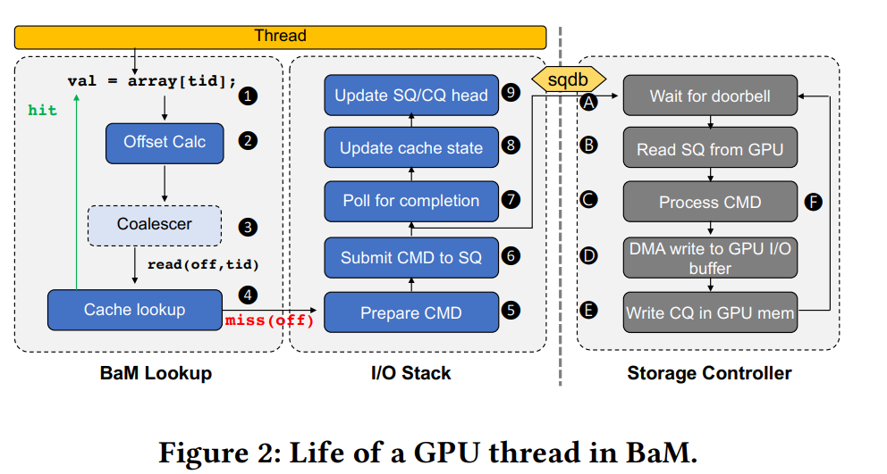 그림 2를 통해 전반적인 BaM System에 대해 설명하겠다. (1) array-like API를 제공하여 thread ID를 이용한 접근이 가능하도록 하였다. (2) offset(cache line)을 계산하고 (3) coalescer를 통해서 같은 cache line에 접근하는 것들을 coalescing한다. (4) cache에서 hit이 되면 데이터를 반환하고, miss가 나면 I/O stack에 들어가게 된다. (5) I/O request를 (6) submission queue에 넣고, (7) storage controller가 completion queue에 넣어줄 때까지 기다린다. (A) Doorbell register를 update 하고 (B) stroage controller가 SQ entrie들을 fetch 한다. (C) CMD를 처리하고 (D) SSD의 data를 GPU memory에 전송한다. (E) 마지막으로 Completion Queue에 Post 한다. (8) 이후 cache state를 업데이트하고 (9) SQ/CQ head도 업데이트한다.