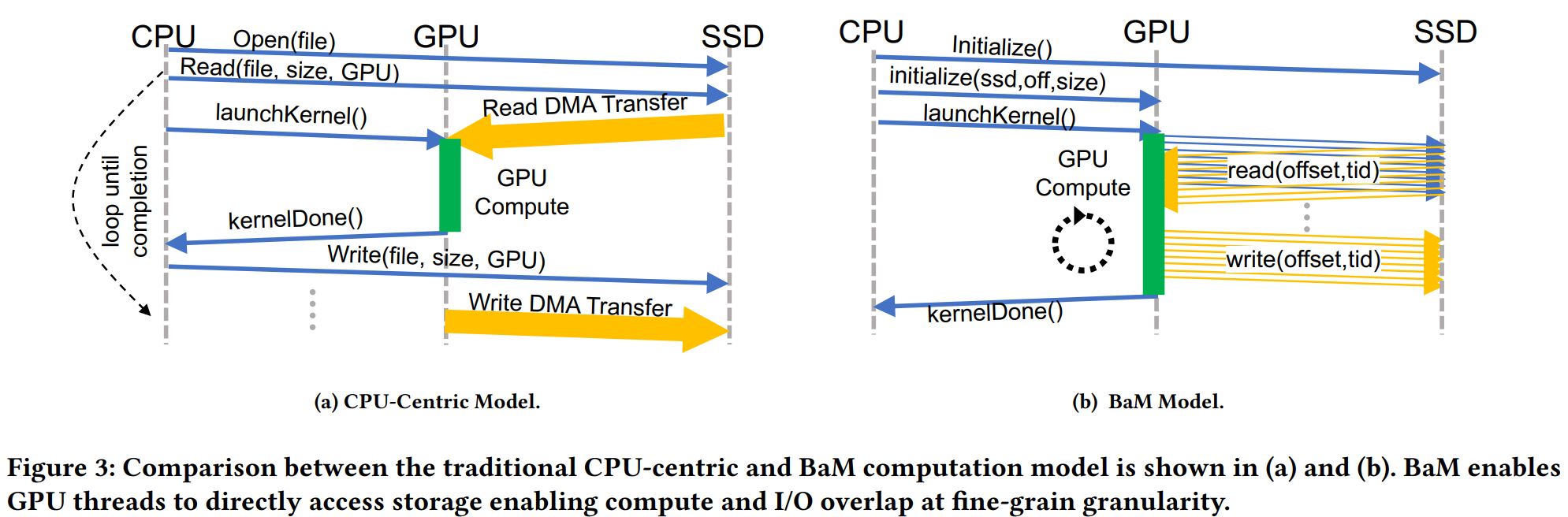 기존 GPU가 data를 가져오는 방법은 CPU 메모리에 존재하는 data를 받아서 사용했다. Data 크기가 커짐에 따라서 DRAM 메모리뿐만 아니라 NAND까지 사용하게 되었다. 하지만 기존 방식은 coarse-grained 방법으로 데이터를 전송했으며 이는 I/O amplification 문제를 야기한다. 이를 해결하고자 GPU orchestrate 방식의 BaM을 제안한다.