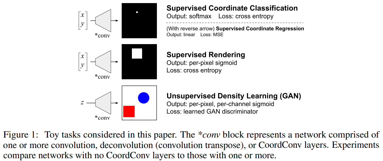 이 연구에서 CNN이 직교좌표 정보를 픽셀로 표현하는 것과 반대로 픽셀을 직교좌표 정보로 받아오는 것에 무능력하다는 것을 분석하고 제시한다. 말로만 들었을 때는 쉬운 task처럼 보이지만 예상과 달리 convolution은 이 task에 어려움이 있었다.