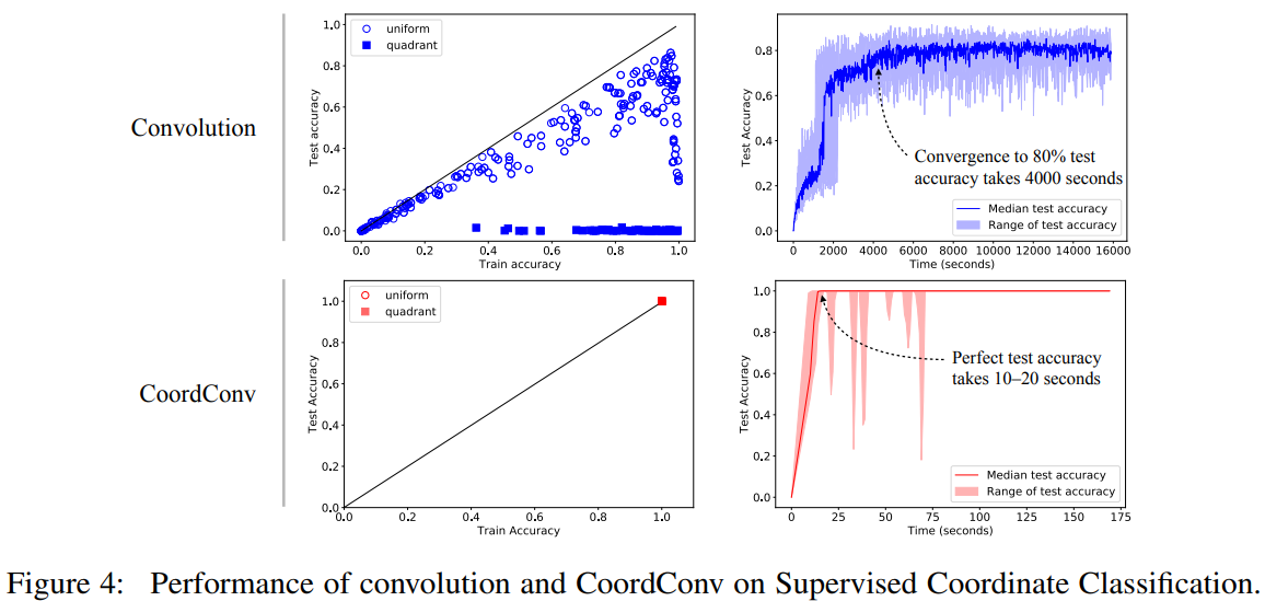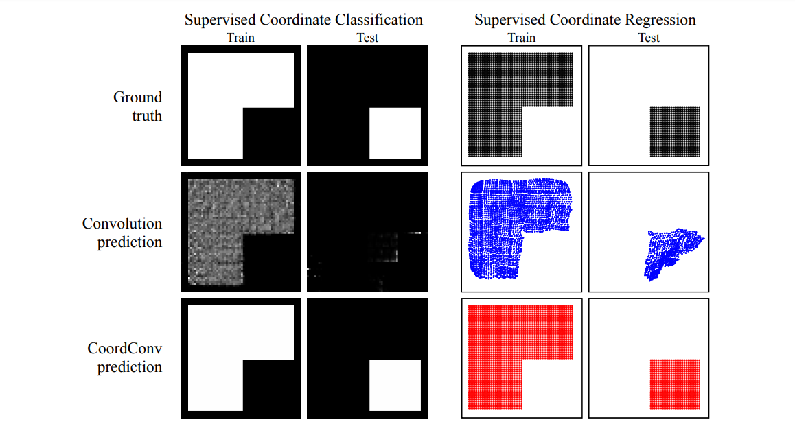 오른쪽의 Supervised Coordinate Regression 결과 사진을 보면 Conv는 전혀 이상한 곳에 점을 찍고 있고, CoordConv는 Ground truth와 거의 완벽하게 동일한 것을 확인할 수 있다. 이는 generalize가 잘 된 것을 의미한다.