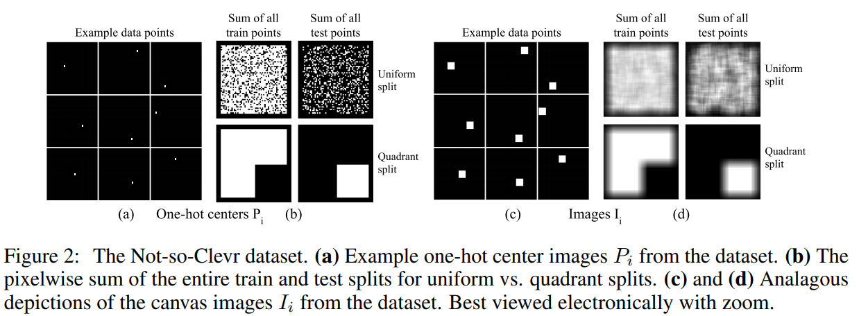 이것들은 dataset을 보고 질문(파란색 사각형은 어디에 있는가?)에 답(중앙 아래)하는 모델에서 많이 사용된다. 하지만 여기서는 generative model에 사용된다. Not-so-Clevr은 9x9 사각형으로 구성되어 있으며, 사각형은 64x64 크기의 canvas에 놓여 있다. 사각형의 위치는 64x64 grid에 제한되어 있다. 이 뜻은 square의 중점은 56x56 area에만 있을 수 있다는 뜻인데 64x64 크기의 canvas에 9x9 사각형이 안에 존재해야 한다고 생각하면 이해할 수 있을 것이다.