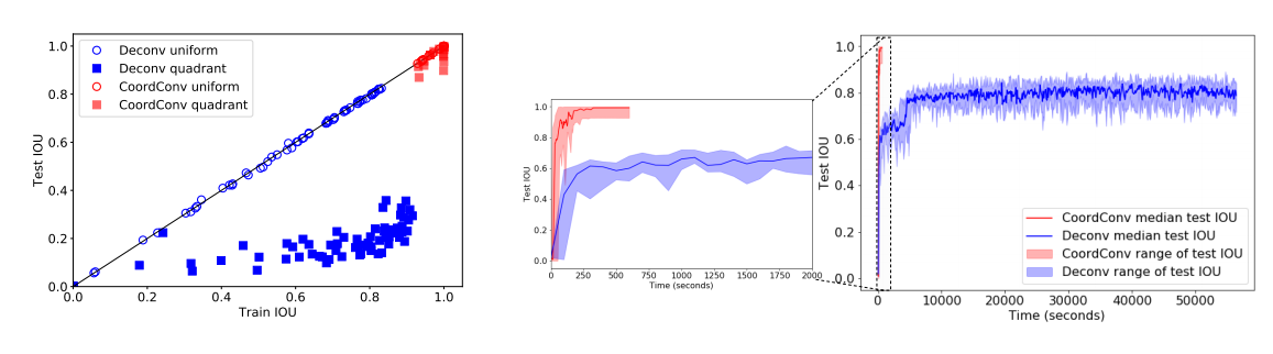 오른쪽 사진을 보면 학습하는데 걸린 시간이 CoordConv가 훨씬 짧은 것을 볼 수 있으며 IOU도 훨씬 높은 것을 확인할 수 있다.