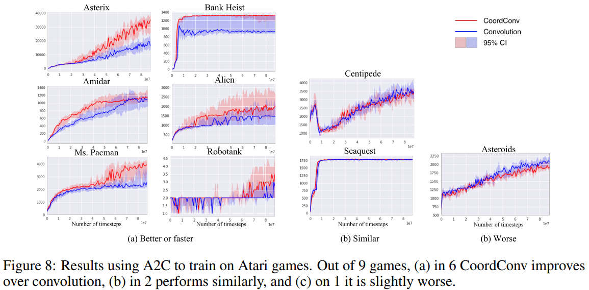 Reinforcement Learning: CoordConv를 추가하면서 몇몇 게임들에 대해서 성능 향상이 일어났다. 아래 그림을 보면 대부분의 게임에서 성능 향상이 있었고, Pacman이나 Back Heist 같은 위치 정보가 중요한 게임들에 대해서 높은 성능 향상을 보여준다.
